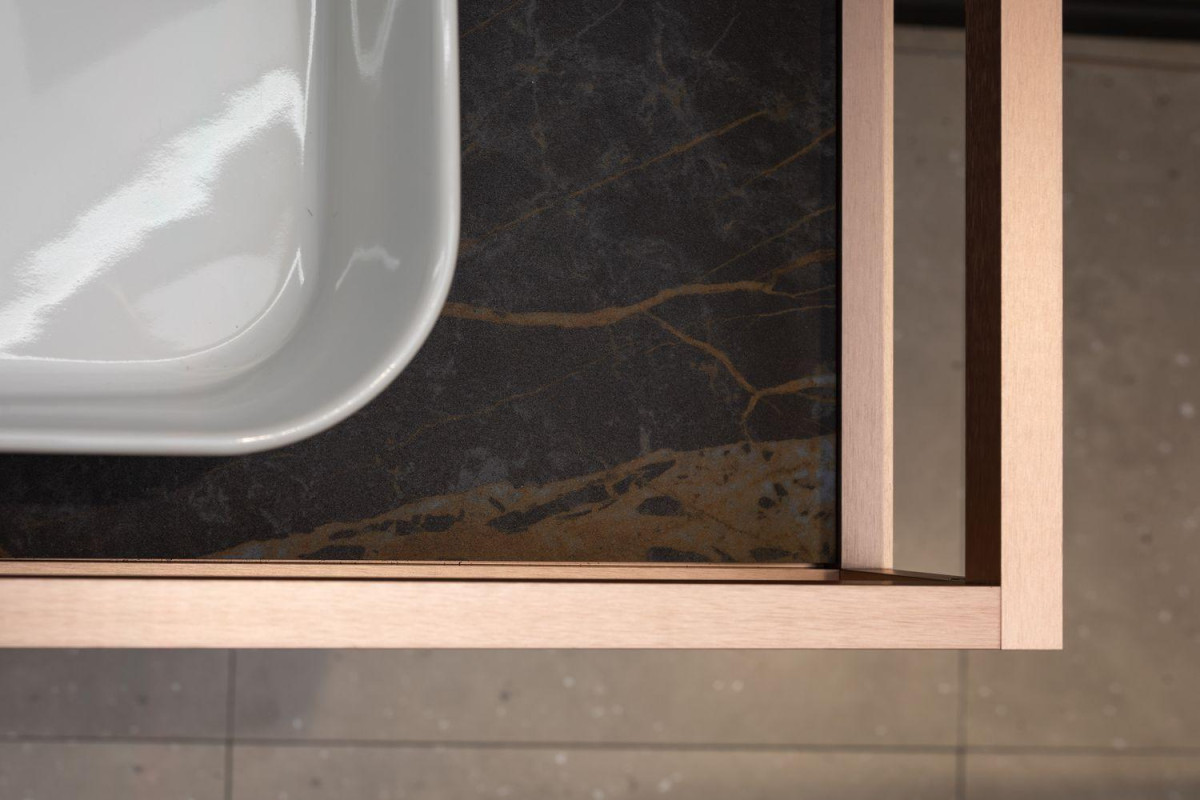 Стильные каркасы тумб и пеналов выполнены из металла, имеют брашированную поверхность