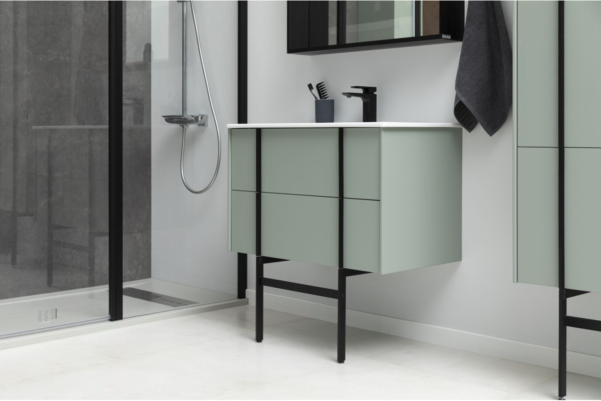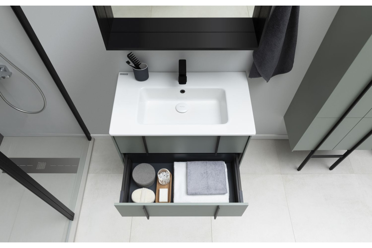 Тумбы оснащены специальной пластиковой рамой, которая надежно защищает вырез под сифон, служит органайзером и позволяет закрепить дополнительный набор контейнеров для хранения.